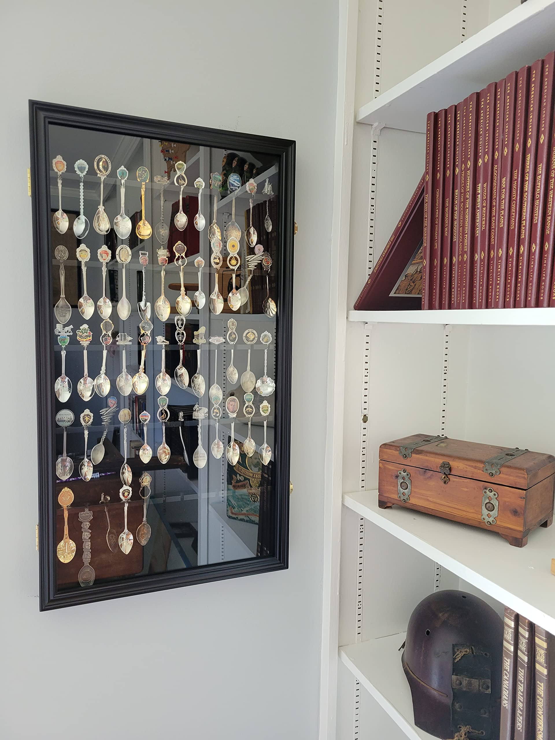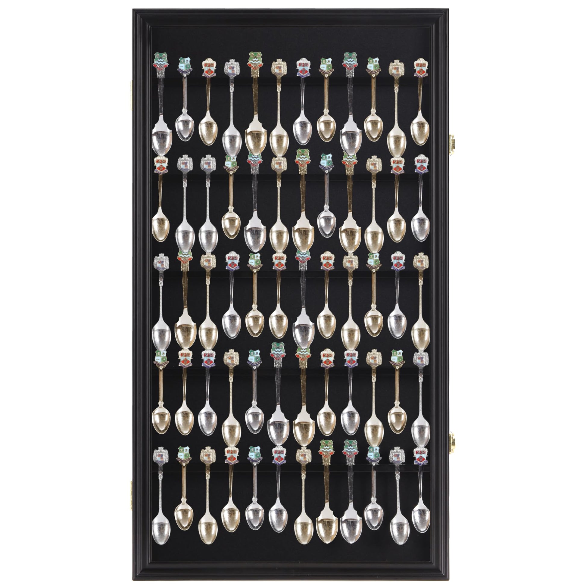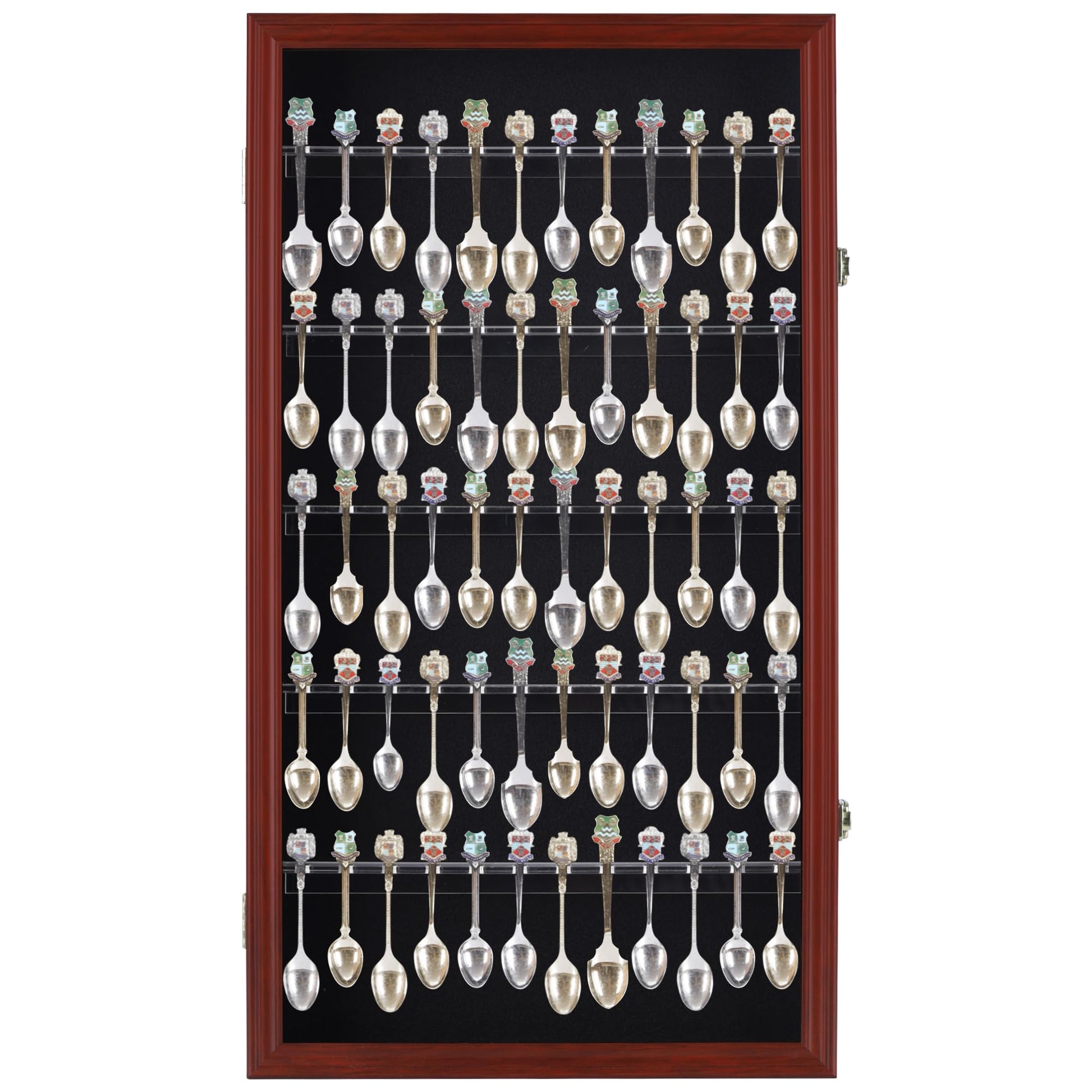 DisplayGifts 60 Souvenir Spoon Tea Spoon Display Case Rack Holder Wall Cabinet Collection Frame with UV Protection, Lockable Door (Cherry Finish)